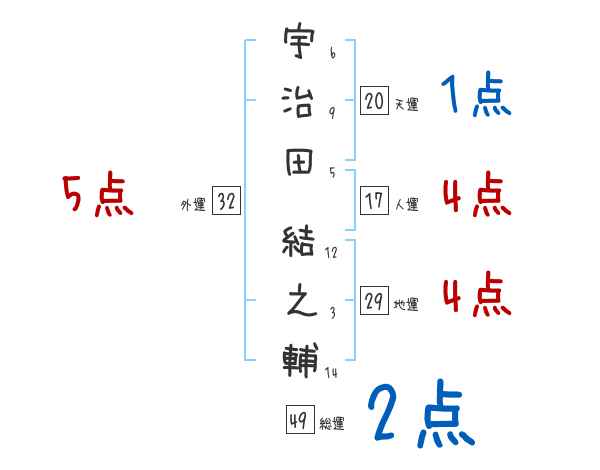 外運![]() | 宇治田結之輔さんの外運は32画の5つ星!柔軟性があり成功する。チャンスが多く金運が良い。 生活面を象徴する運勢です。外部から受ける影響力を表し、結婚運、家庭運や職場、環境への順応性を表します。 |