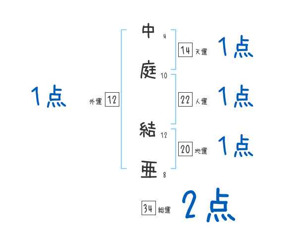 総運![]() | 中庭結亜さんの総運は34画の2つ星!独創性に優れるが、自尊心が強く災難に注意しましょう。 あなたの人生を表す1番重要な運勢です。生涯を通じて影響する総合運となり、主に50歳以降の晩年期に影響を及ぼします。 |