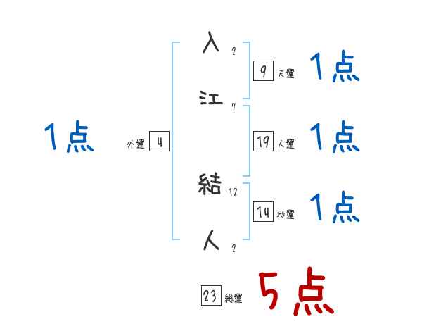 天運![]() | 入江結人さんの天運は9画の1つ星!消極的で才能を発揮することが苦手なことも。周りの意見に耳を傾けましょう。 家系が持つ宿命的な運勢を表します。祖先から受け継いだ苗字ですので自分の力が及びません。家柄を象徴します。 |