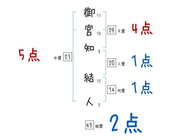 総運![]() | 御宮知結人さんの総運は43画の2つ星!頑固な性格で独立心が強いかも。やや非現実的で浪費に注意しましょう。 あなたの人生を表す1番重要な運勢です。生涯を通じて影響する総合運となり、主に50歳以降の晩年期に影響を及ぼします。 |