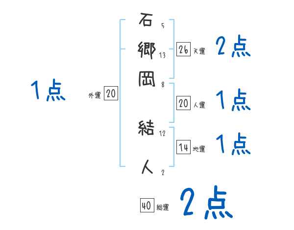 総運![]() | 石郷岡結人さんの総運は40画の2つ星!自信過剰で物事に固執するためトラブルに注意。 あなたの人生を表す1番重要な運勢です。生涯を通じて影響する総合運となり、主に50歳以降の晩年期に影響を及ぼします。 |