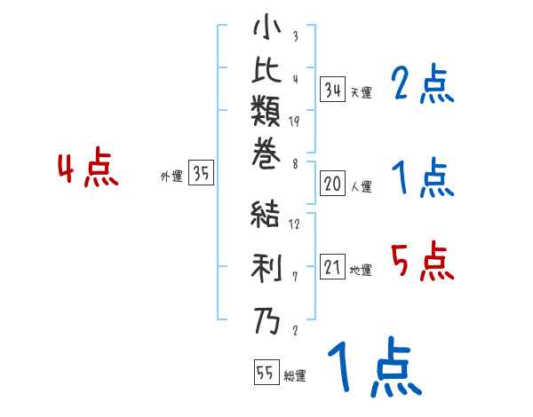 外運![]() | 小比類巻結利乃さんの外運は35画の4つ星!温厚な性格で感受性が高い。穏和な性格で人望が厚い。 生活面を象徴する運勢です。外部から受ける影響力を表し、結婚運、家庭運や職場、環境への順応性を表します。 |