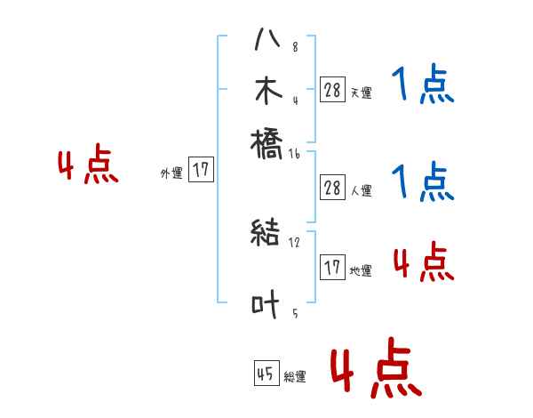 天運![]() | 八木橋結叶さんの天運は28画の1つ星!家庭環境に注意。スポーツで活躍できる能力があるかも。 家系が持つ宿命的な運勢を表します。祖先から受け継いだ苗字ですので自分の力が及びません。家柄を象徴します。 |