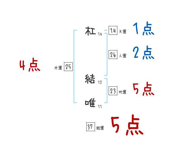 天運![]() | 杠結唯さんの天運は14画の1つ星!人に対して優しいがストレスを溜め込みがち。人間関係のトラブルを避けるよう気をつけましょう。 家系が持つ宿命的な運勢を表します。祖先から受け継いだ苗字ですので自分の力が及びません。家柄を象徴します。 |