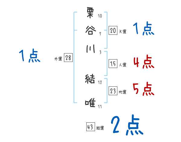 総運![]() | 栗谷川結唯さんの総運は43画の2つ星!頑固な性格で独立心が強いかも。やや非現実的で浪費に注意しましょう。 あなたの人生を表す1番重要な運勢です。生涯を通じて影響する総合運となり、主に50歳以降の晩年期に影響を及ぼします。 |