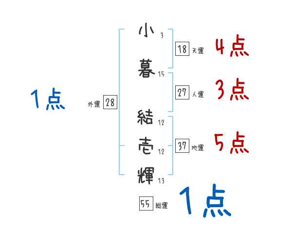 天運![]() | 小暮結壱輝さんの天運は18画の4つ星!情熱的で剛気。忍耐力があり信頼される。 家系が持つ宿命的な運勢を表します。祖先から受け継いだ苗字ですので自分の力が及びません。家柄を象徴します。 |