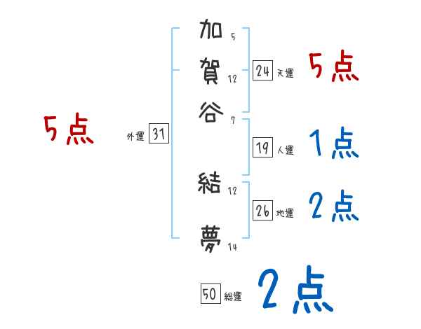 天運![]() | 加賀谷結夢さんの天運は24画の5つ星!家庭運が良く順調な人生。金運にも恵まれる。 家系が持つ宿命的な運勢を表します。祖先から受け継いだ苗字ですので自分の力が及びません。家柄を象徴します。 |