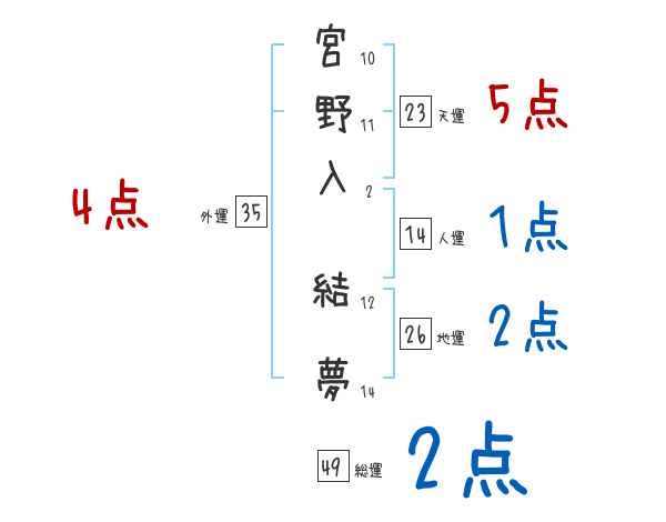外運![]() | 宮野入結夢さんの外運は35画の4つ星!温厚な性格で感受性が高い。穏和な性格で人望が厚い。 生活面を象徴する運勢です。外部から受ける影響力を表し、結婚運、家庭運や職場、環境への順応性を表します。 |