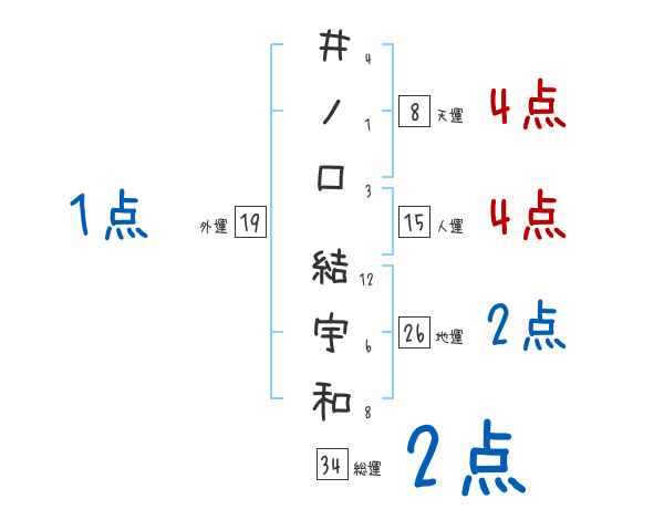 外運![]() | 井ノ口結宇和さんの外運は19画の1つ星!優れた才能を持ちますが、協調性が足りないことも。周りの人と協力する事を意識しましょう。 生活面を象徴する運勢です。外部から受ける影響力を表し、結婚運、家庭運や職場、環境への順応性を表します。 |