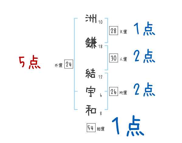 外運![]() | 洲鎌結宇和さんの外運は24画の5つ星!家庭運が良く順調な人生。金運にも恵まれる。 生活面を象徴する運勢です。外部から受ける影響力を表し、結婚運、家庭運や職場、環境への順応性を表します。 |