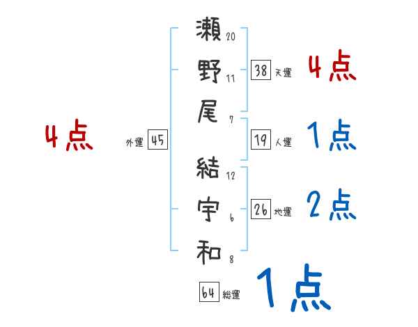 外運![]() | 瀬野尾結宇和さんの外運は45画の4つ星!もくもくと物事を進め達成する。地味な努力家。 生活面を象徴する運勢です。外部から受ける影響力を表し、結婚運、家庭運や職場、環境への順応性を表します。 |