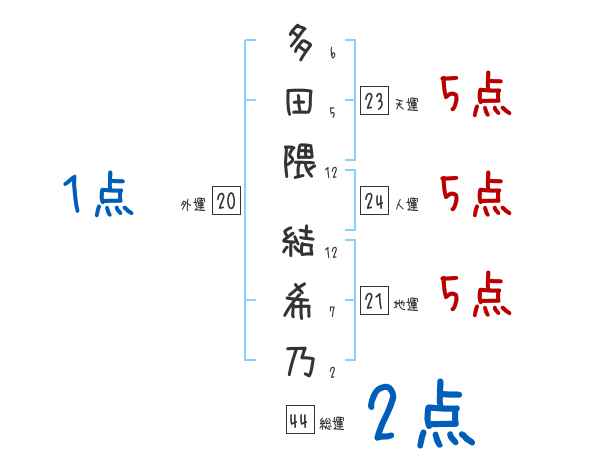総運![]() | 多田隈結希乃さんの総運は44画の2つ星!誠実で慎重な性格。物事を考えすぎないように注意しましょう。 あなたの人生を表す1番重要な運勢です。生涯を通じて影響する総合運となり、主に50歳以降の晩年期に影響を及ぼします。 |