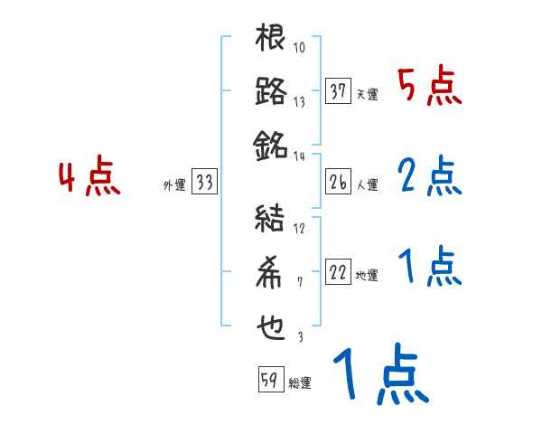 総運![]() | 根路銘結希也さんの総運は59画の1つ星!意志の弱さであきらめることが多いかも。粘り強さが必要。 あなたの人生を表す1番重要な運勢です。生涯を通じて影響する総合運となり、主に50歳以降の晩年期に影響を及ぼします。 |