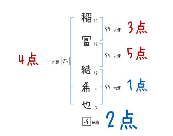 天運![]() | 稲冨結希也さんの天運は27画の3つ星!頭脳明晰だが強情で摩擦が多い傾向。孤立に注意。 家系が持つ宿命的な運勢を表します。祖先から受け継いだ苗字ですので自分の力が及びません。家柄を象徴します。 |