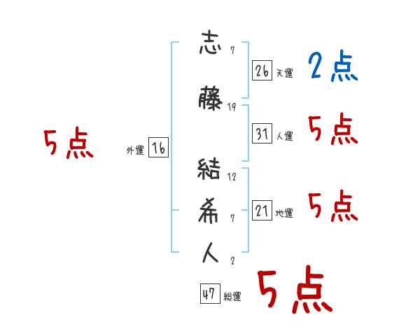 外運![]() | 志藤結希人さんの外運は16画の5つ星!人望が厚く大きく発展する。逆転成功が見える。 生活面を象徴する運勢です。外部から受ける影響力を表し、結婚運、家庭運や職場、環境への順応性を表します。 |