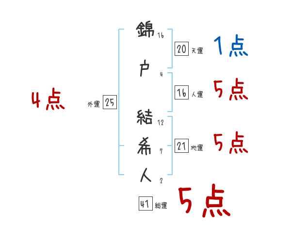 人運![]() | 錦戸結希人さんの人運は16画の5つ星!人望が厚く大きく発展する。逆転成功が見える。 性格や才能などを表す2番目に重要な運勢です。人間関係や協調性、社会的な成功に影響します。主に20歳から50歳ぐらいまでの中年期の運勢を表します。 |