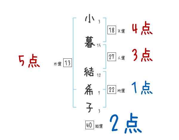 天運![]() | 小暮結希子さんの天運は18画の4つ星!情熱的で剛気。忍耐力があり信頼される。 家系が持つ宿命的な運勢を表します。祖先から受け継いだ苗字ですので自分の力が及びません。家柄を象徴します。 |