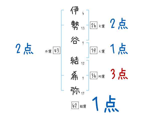 天運![]() | 伊勢谷結希弥さんの天運は26画の2つ星!波瀾万丈かも。信頼できる人を大事にしましょう。 家系が持つ宿命的な運勢を表します。祖先から受け継いだ苗字ですので自分の力が及びません。家柄を象徴します。 |