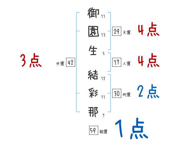 総運![]() | 御園生結彩那さんの総運は59画の1つ星!意志の弱さであきらめることが多いかも。粘り強さが必要。 あなたの人生を表す1番重要な運勢です。生涯を通じて影響する総合運となり、主に50歳以降の晩年期に影響を及ぼします。 |
