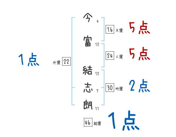 天運![]() | 今富結志朗さんの天運は16画の5つ星!人望が厚く大きく発展する。逆転成功が見える。 家系が持つ宿命的な運勢を表します。祖先から受け継いだ苗字ですので自分の力が及びません。家柄を象徴します。 |
