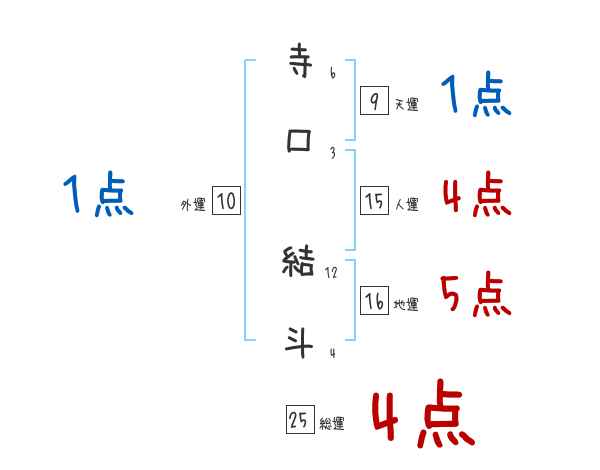 天運![]() | 寺口結斗さんの天運は9画の1つ星!消極的で才能を発揮することが苦手なことも。周りの意見に耳を傾けましょう。 家系が持つ宿命的な運勢を表します。祖先から受け継いだ苗字ですので自分の力が及びません。家柄を象徴します。 |