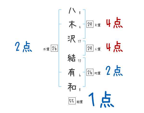 天運![]() | 八木沢結有和さんの天運は29画の4つ星!完全主義で才能がある。厳格な心の持ち主。 家系が持つ宿命的な運勢を表します。祖先から受け継いだ苗字ですので自分の力が及びません。家柄を象徴します。 |