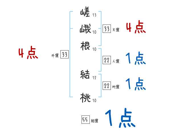 天運![]() | 嵯峨根結桃さんの天運は33画の4つ星!権力志向でプライドが高い。勇気があり運を切り開き成功する。 家系が持つ宿命的な運勢を表します。祖先から受け継いだ苗字ですので自分の力が及びません。家柄を象徴します。 |