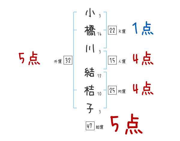 総運![]() | 小橋川結桔子さんの総運は47画の5つ星!実力が開花し発展する円満な人生。財に恵まれる。 あなたの人生を表す1番重要な運勢です。生涯を通じて影響する総合運となり、主に50歳以降の晩年期に影響を及ぼします。 |