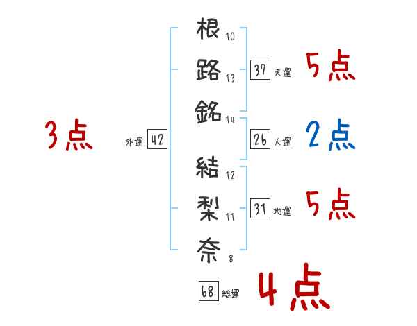 外運![]() | 根路銘結梨奈さんの外運は42画の3つ星!病気に注意。多芸であるが消極的でおとなしい。 生活面を象徴する運勢です。外部から受ける影響力を表し、結婚運、家庭運や職場、環境への順応性を表します。 |