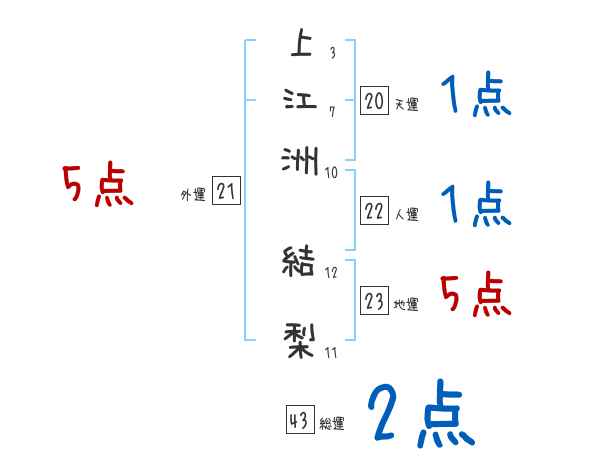 外運![]() | 上江洲結梨さんの外運は21画の5つ星!統率力がある。独立し成功する。名誉を手に入れる。 生活面を象徴する運勢です。外部から受ける影響力を表し、結婚運、家庭運や職場、環境への順応性を表します。 |