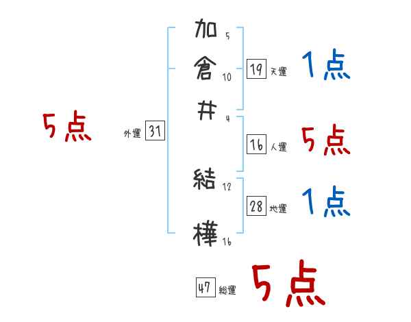 総運![]() | 加倉井結樺さんの総運は47画の5つ星!実力が開花し発展する円満な人生。財に恵まれる。 あなたの人生を表す1番重要な運勢です。生涯を通じて影響する総合運となり、主に50歳以降の晩年期に影響を及ぼします。 |