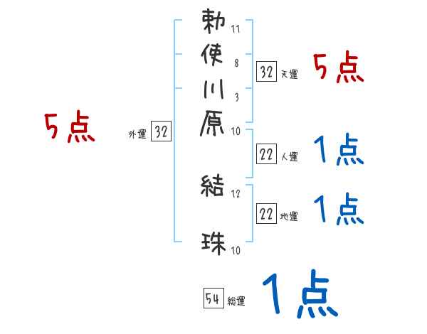 天運![]() | 勅使川原結珠さんの天運は32画の5つ星!柔軟性があり成功する。チャンスが多く金運が良い。 家系が持つ宿命的な運勢を表します。祖先から受け継いだ苗字ですので自分の力が及びません。家柄を象徴します。 |