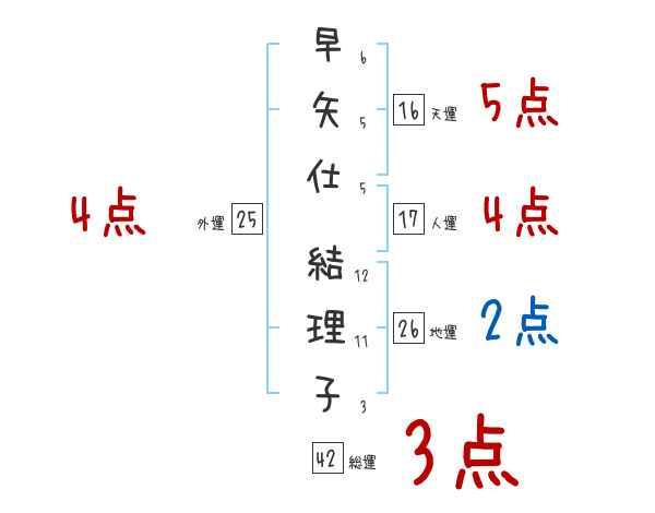 天運![]() | 早矢仕結理子さんの天運は16画の5つ星!人望が厚く大きく発展する。逆転成功が見える。 家系が持つ宿命的な運勢を表します。祖先から受け継いだ苗字ですので自分の力が及びません。家柄を象徴します。 |