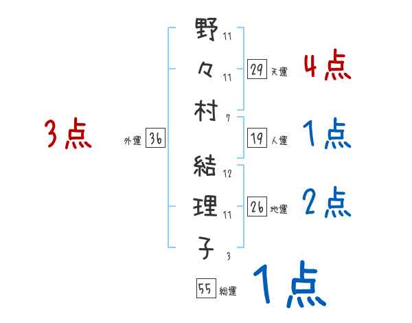 外運![]() | 野々村結理子さんの外運は36画の3つ星!先見性が豊かです。多少神経質で苦労することも。 生活面を象徴する運勢です。外部から受ける影響力を表し、結婚運、家庭運や職場、環境への順応性を表します。 |