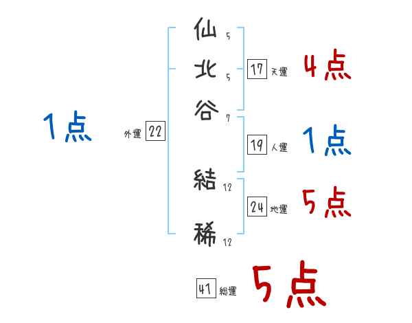 外運![]() | 仙北谷結稀さんの外運は22画の1つ星!努力することが苦手ないっぽう手先が器用。芸術性にも優れる。 生活面を象徴する運勢です。外部から受ける影響力を表し、結婚運、家庭運や職場、環境への順応性を表します。 |