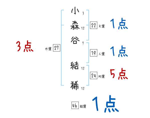 総運![]() | 小森谷結稀さんの総運は46画の1つ星!迷走することが多く苦労するかも。目先のことにとらわれないように。 あなたの人生を表す1番重要な運勢です。生涯を通じて影響する総合運となり、主に50歳以降の晩年期に影響を及ぼします。 |