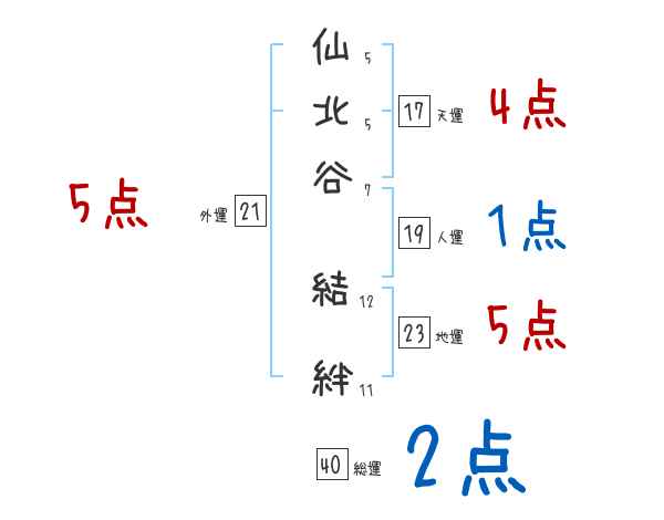 天運![]() | 仙北谷結絆さんの天運は17画の4つ星!積極的な行動力。地位を気づき財産を手に入れる。純粋な心と直感力。 家系が持つ宿命的な運勢を表します。祖先から受け継いだ苗字ですので自分の力が及びません。家柄を象徴します。 |