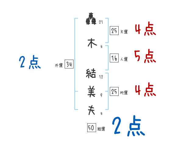 人運![]() | 轟木結美夫さんの人運は16画の5つ星!人望が厚く大きく発展する。逆転成功が見える。 性格や才能などを表す2番目に重要な運勢です。人間関係や協調性、社会的な成功に影響します。主に20歳から50歳ぐらいまでの中年期の運勢を表します。 |
