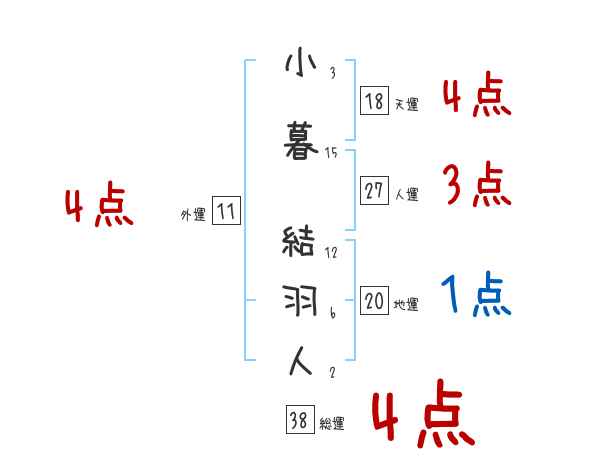 天運![]() | 小暮結羽人さんの天運は18画の4つ星!情熱的で剛気。忍耐力があり信頼される。 家系が持つ宿命的な運勢を表します。祖先から受け継いだ苗字ですので自分の力が及びません。家柄を象徴します。 |