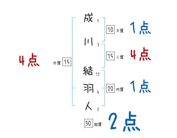 天運![]() | 成川結羽人さんの天運は10画の1つ星!不安を感じやすい傾向。ストレスを抱えないように注意しましょう。 家系が持つ宿命的な運勢を表します。祖先から受け継いだ苗字ですので自分の力が及びません。家柄を象徴します。 |