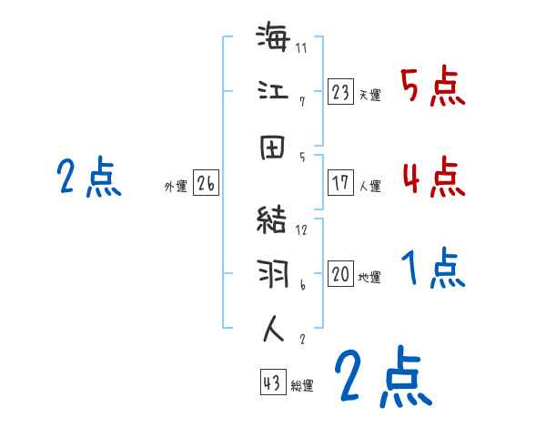 外運![]() | 海江田結羽人さんの外運は26画の2つ星!波瀾万丈かも。信頼できる人を大事にしましょう。 生活面を象徴する運勢です。外部から受ける影響力を表し、結婚運、家庭運や職場、環境への順応性を表します。 |