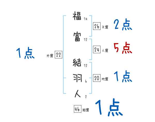 天運![]() | 福富結羽人さんの天運は26画の2つ星!波瀾万丈かも。信頼できる人を大事にしましょう。 家系が持つ宿命的な運勢を表します。祖先から受け継いだ苗字ですので自分の力が及びません。家柄を象徴します。 |