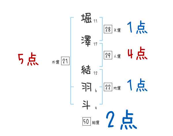 外運![]() | 堀澤結羽斗さんの外運は21画の5つ星!統率力がある。独立し成功する。名誉を手に入れる。 生活面を象徴する運勢です。外部から受ける影響力を表し、結婚運、家庭運や職場、環境への順応性を表します。 |