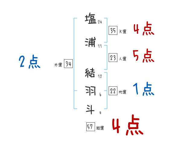 外運![]() | 塩浦結羽斗さんの外運は34画の2つ星!独創性に優れるが、自尊心が強く災難に注意しましょう。 生活面を象徴する運勢です。外部から受ける影響力を表し、結婚運、家庭運や職場、環境への順応性を表します。 |