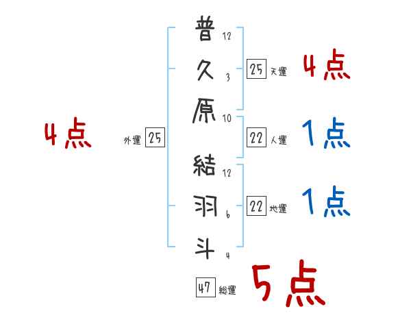 天運![]() | 普久原結羽斗さんの天運は25画の4つ星!個性があり才能があふれる。強運の持ち主で発展する。 家系が持つ宿命的な運勢を表します。祖先から受け継いだ苗字ですので自分の力が及びません。家柄を象徴します。 |