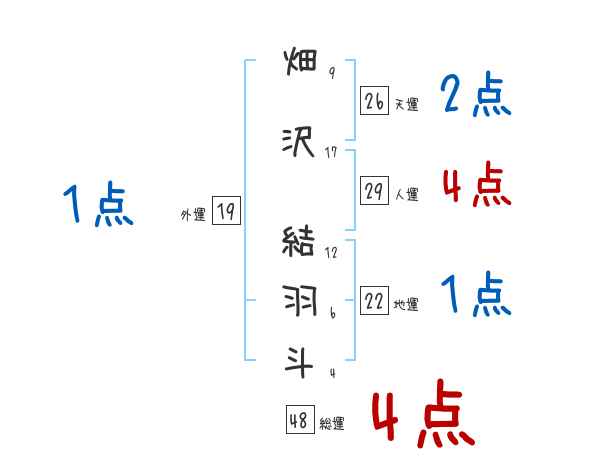 天運![]() | 畑沢結羽斗さんの天運は26画の2つ星!波瀾万丈かも。信頼できる人を大事にしましょう。 家系が持つ宿命的な運勢を表します。祖先から受け継いだ苗字ですので自分の力が及びません。家柄を象徴します。 |