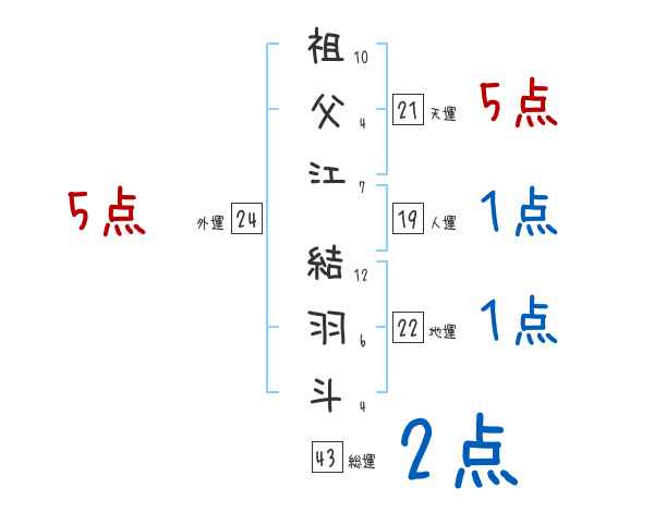 外運![]() | 祖父江結羽斗さんの外運は24画の5つ星!家庭運が良く順調な人生。金運にも恵まれる。 生活面を象徴する運勢です。外部から受ける影響力を表し、結婚運、家庭運や職場、環境への順応性を表します。 |
