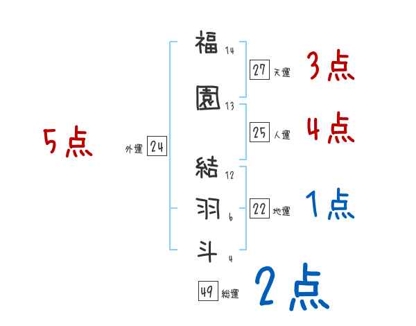 外運![]() | 福園結羽斗さんの外運は24画の5つ星!家庭運が良く順調な人生。金運にも恵まれる。 生活面を象徴する運勢です。外部から受ける影響力を表し、結婚運、家庭運や職場、環境への順応性を表します。 |