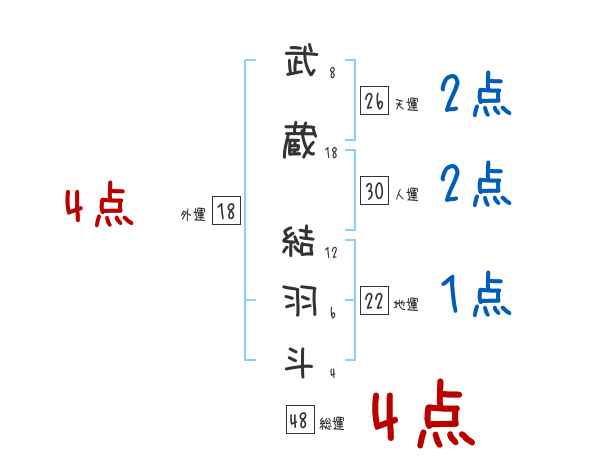 総運![]() | 武蔵結羽斗さんの総運は48画の4つ星!賢明な性格で人望が厚い。指導力があり多くの人に尊敬される。 あなたの人生を表す1番重要な運勢です。生涯を通じて影響する総合運となり、主に50歳以降の晩年期に影響を及ぼします。 |