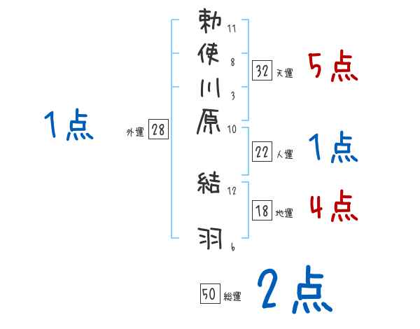 天運![]() | 勅使川原結羽さんの天運は32画の5つ星!柔軟性があり成功する。チャンスが多く金運が良い。 家系が持つ宿命的な運勢を表します。祖先から受け継いだ苗字ですので自分の力が及びません。家柄を象徴します。 |